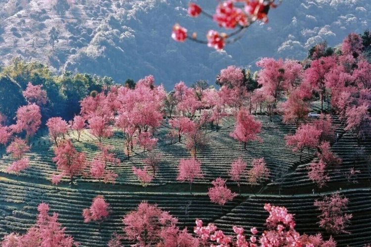 南涧无量山樱花谷是国家AAA级景区,位于大理南涧无量山镇。每年11月底至12月,茶园中的冬樱花盛开,与翠绿的茶树相互映衬,形成“茶樱相伴”的美景,景区还融合了彝族文化、茶道文化等,吸引众多游客前来观赏