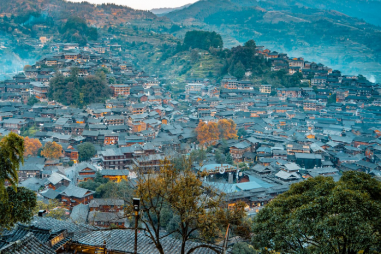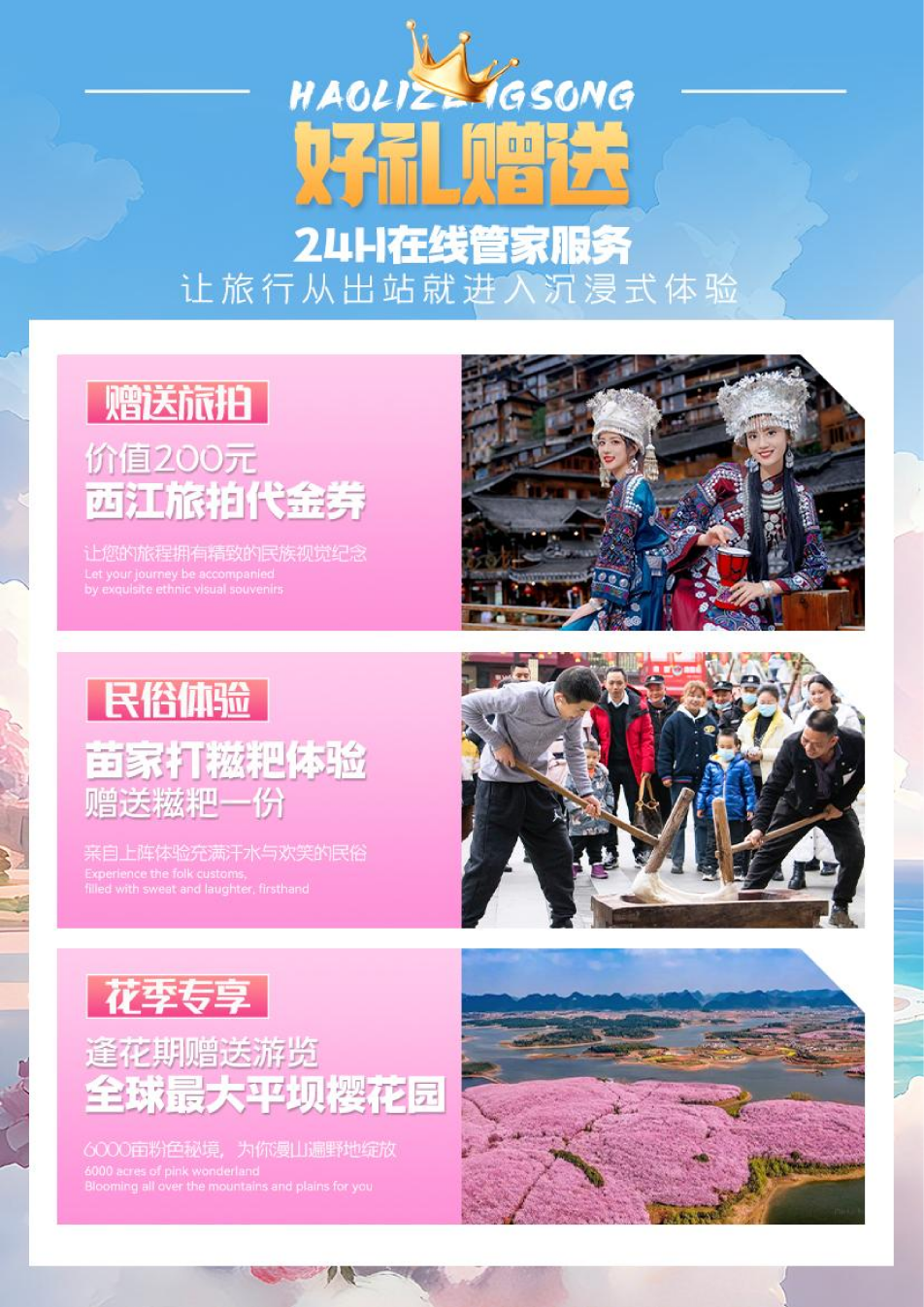 【西江千户苗寨晨游】:清晨的苗寨静谧祥和。特色玩法:走街串巷探访吊脚楼群、苗寨梯田,了解苗族生活习俗与建筑特色,体验打糍粑互动(赠送糍粑一份),穿苗族传统服饰享旅拍优惠(赠代金券)。