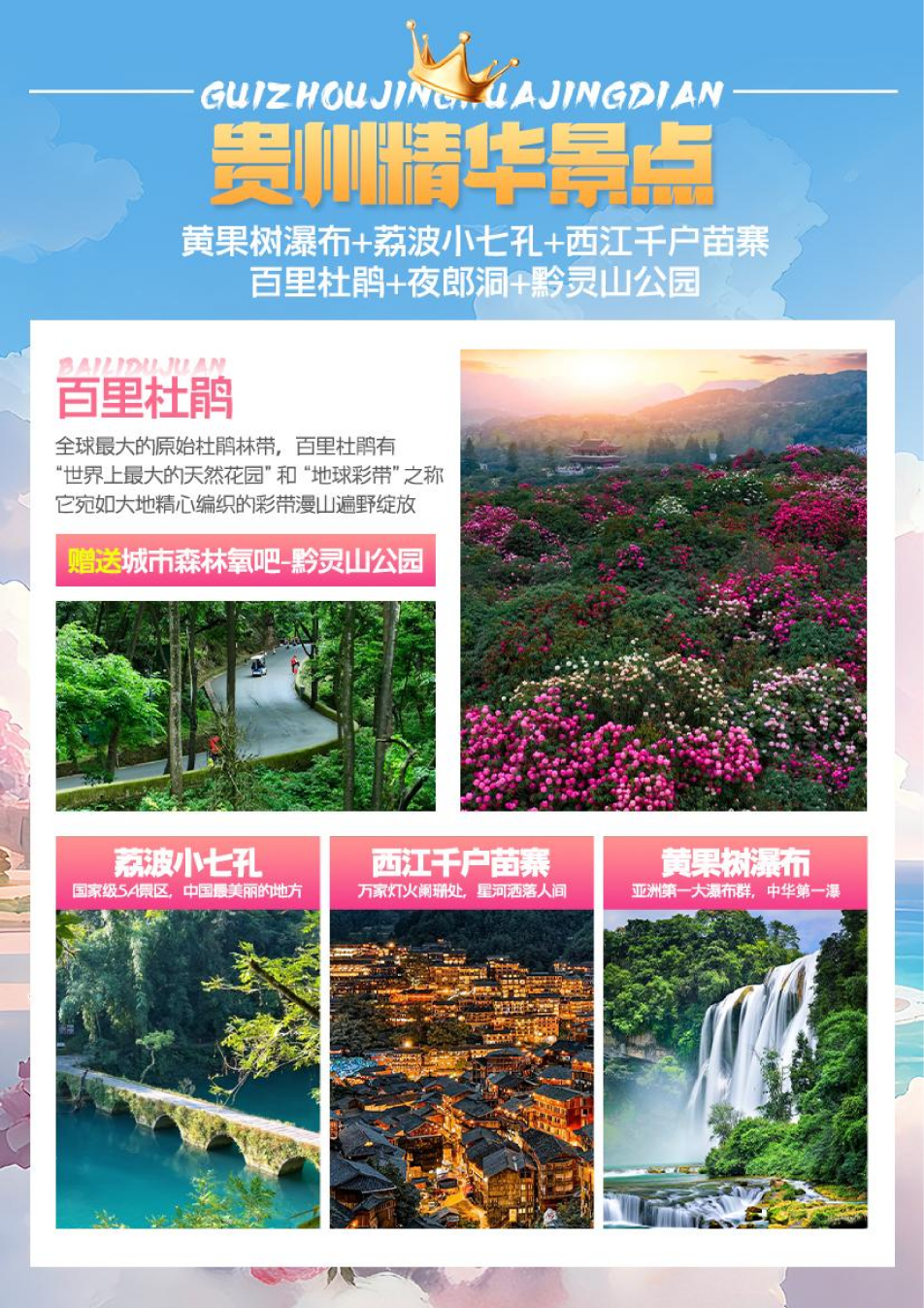 1、不含所列景点首道门票,65 岁以下需要补景区大门票打包价格 540 元/人(小七孔 120、西江 90、黄