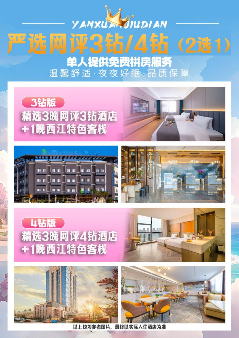 四钻版:精选 3 晚网评 4 钻酒店+1 晚西江特色客栈,房差 450 元/人,三人住一间含早退 250 元/人