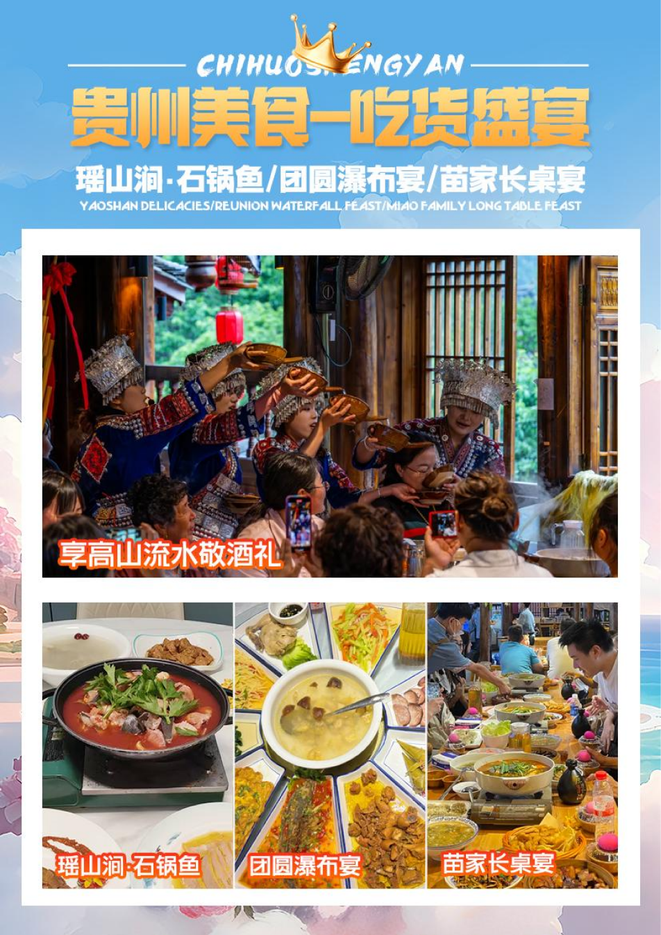 1.费用包含:深圳北/广州南-贵阳北/东往返动车二等座;3晚网评3/4钻酒店+1晚西江特色客栈;4早4正餐(含瑶山涧石锅鱼、团圆瀑布宴、长桌宴);2+1陆地头等舱(8人以下匹配对应车型);持证中文导游服务;旅行社责任险;24小时接站、每人每天1瓶矿泉水、旅拍代金券、打糍粑体验及糍粑赠送。
