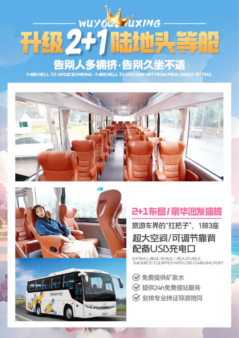 4. 用车:2+1 陆地头等舱,旅程更舒适【保证每人 1 正座】。(8 人以下根据人数匹配 5 座-19 座车型、5 人以下