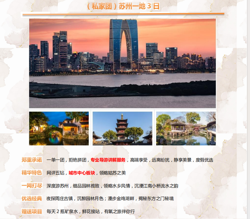 (参考时间)17:00 游览【平江路历史街区】是苏州的一条历史老街,是一条沿河的小路,其河名为平江河。平江路历史街区是苏州古城保存最为完整的一个区域,堪称古城缩影。800 多年来,不但平江路的河流形态、街道建制与原先基本相仿,而且还分明地保留着“水路并行,河街相邻”的水乡格局。平江路算是苏州保存得最完好的古街了,与观前街一巷之隔,但其清静古朴的生活气息与咫尺外的鼎沸喧哗迥然两个世界。