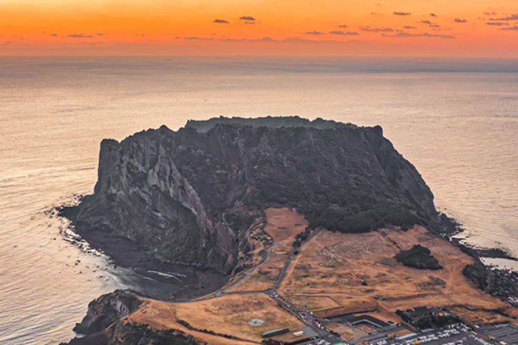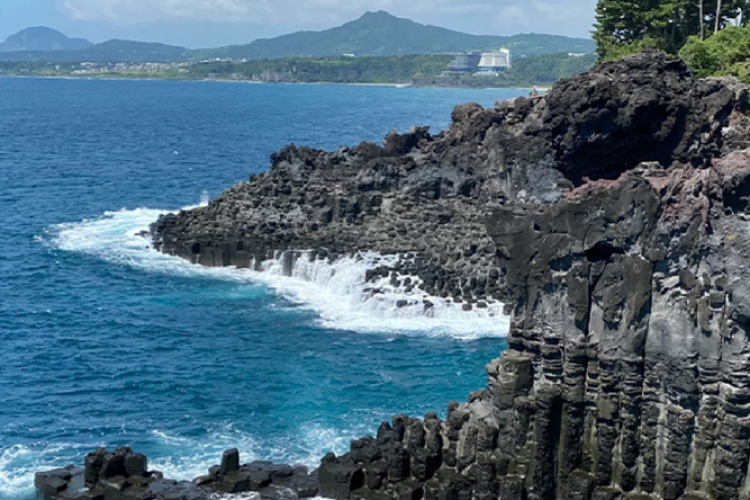 【柱状节理带】柱状节理指的是出现于玄武岩质熔岩里的垂直节理,大部分是多角形(一般为五、六角形)。它是岩浆从火山口喷出,流入西归浦沿岸,遇海水急速冷却,发生收缩作用的结果。此地的柱状节理高达30~40米,宽达1000米左右,其规模在韩国是最大的。