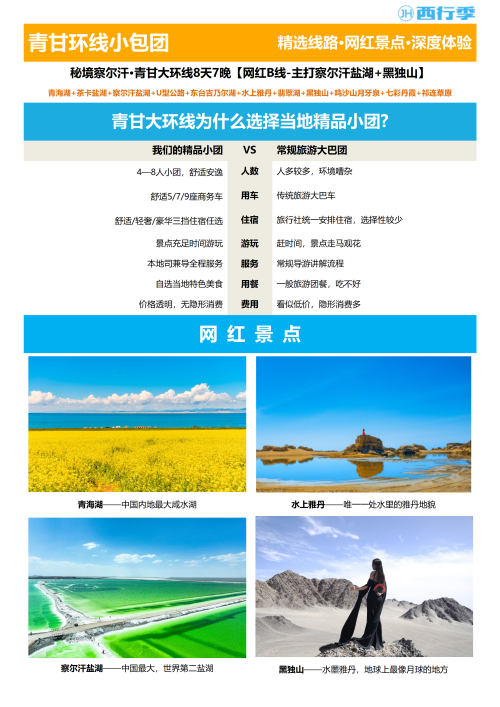 【茶卡盐湖】:“人一生要去的 55 个地方” 之一,被誉为 “天空之镜”。特色玩法:穿鲜艳服饰漫步盐湖浅滩,拍摄水天一色的倒影大片;乘小火车(自理)深入湖心,观赏形态各异的盐雕,感受盐湖的纯净与梦幻。