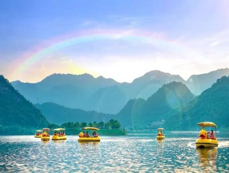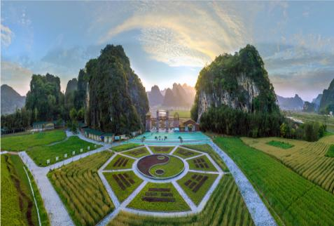 13:00 前往【峰林晓镇】赏百亩花海国家 AAAA 级旅游景区,地处于国家森林公园-英西峰林核心段,喀斯特地貌的山峰景致绮丽,浓郁乡土气息的田园风光,千亩花海烂漫盛开!置身其间,风光绮丽、景致醉人。大有蓝天、青山、碧水回归大自然的神韵!【飞龙桥】英西峰林首座铁索吊桥,耗巨资打造,长达 60 米,宽 4 米的吊索大桥,横跨苏坑河(水边河流域),两岸景色犹如百里画廊的风景!【峰林倒影】斜阳映晚霞,湖光照峰林,落日时分,太阳缓缓从千军峰林后落下,晚霞缓缓升起,湖中倒映出晚霞与峰林!绝美至极。【党建公园】在观赏自然风光的同时,还可以亲身体验着红装、唱红歌,体验红色文化,接受革命传统教育!听英雄故事,传承历久弥坚的精神;唱红色歌谣,坚守矢志不渝的初心。