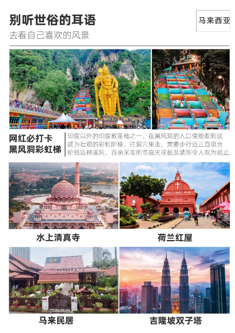 【黑风洞彩虹梯】:距离吉隆坡中心 13 公里,拥有 4 亿年历史的神秘洞穴,马来西亚顶级景点与印度教核心朝圣地,洞穴内寺庙已存续一个多世纪。特色玩法:攀爬色彩斑斓的彩虹梯,探访洞穴中的神圣寺庙,与栖息于此的灵动猴子互动,在古老岩壁与宗教氛围中感受自然与信仰的交融。