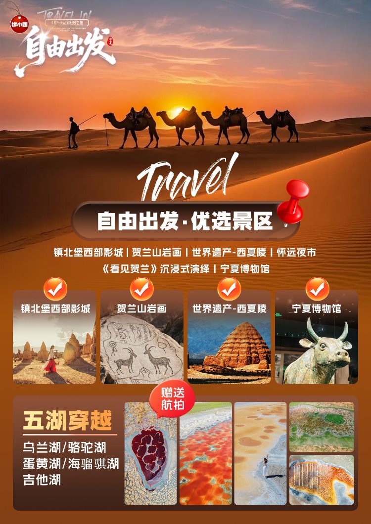 尊敬的贵宾您好!欢迎您参加此次旅行!当您抵达具有“塞上江南”之称的—银川市。我社将安排专人接站,这里地处祖国内陆,热情朴实的民风会感染您,在这里的会让您感受到不一样的风情,抵达市区后入住酒店休息。