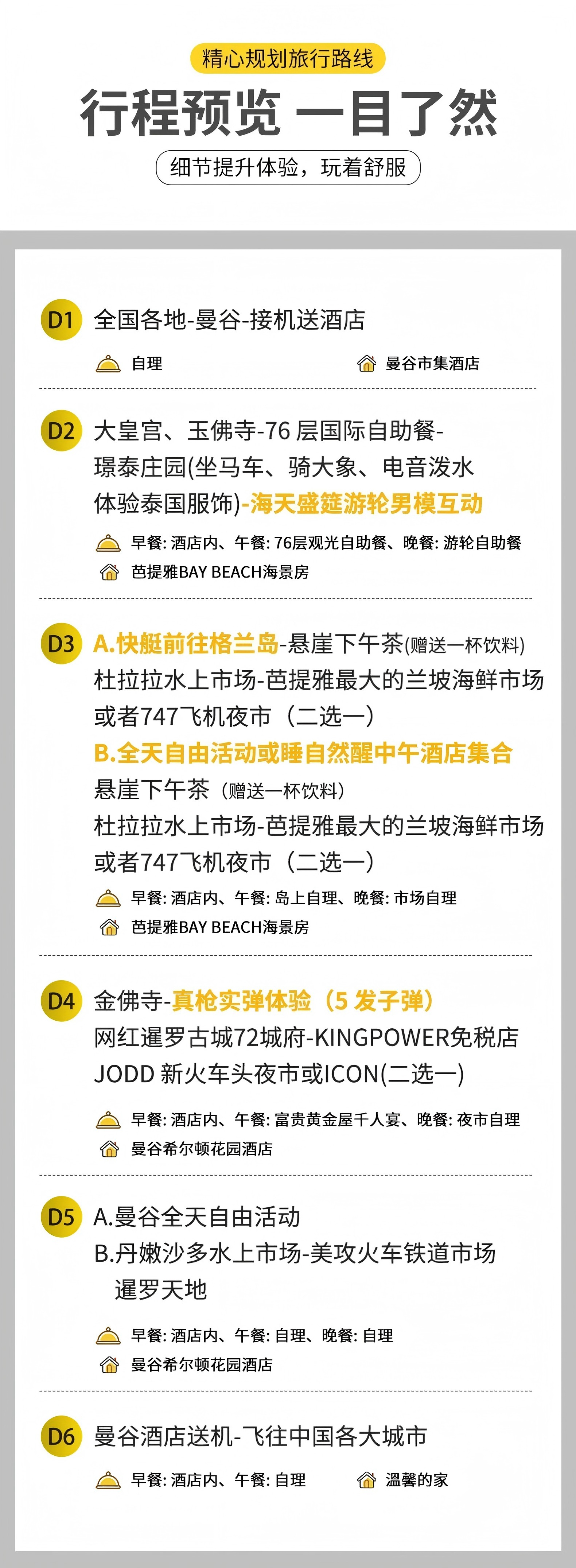 A选择:全天自由活动或睡到自然醒,中午酒店集合,前往悬崖下午茶(赠送一杯饮料)--杜拉拉四方水上市场--芭提雅最大兰坡海鲜市场或者前往网红747飞机夜市(团友商量二选一)。