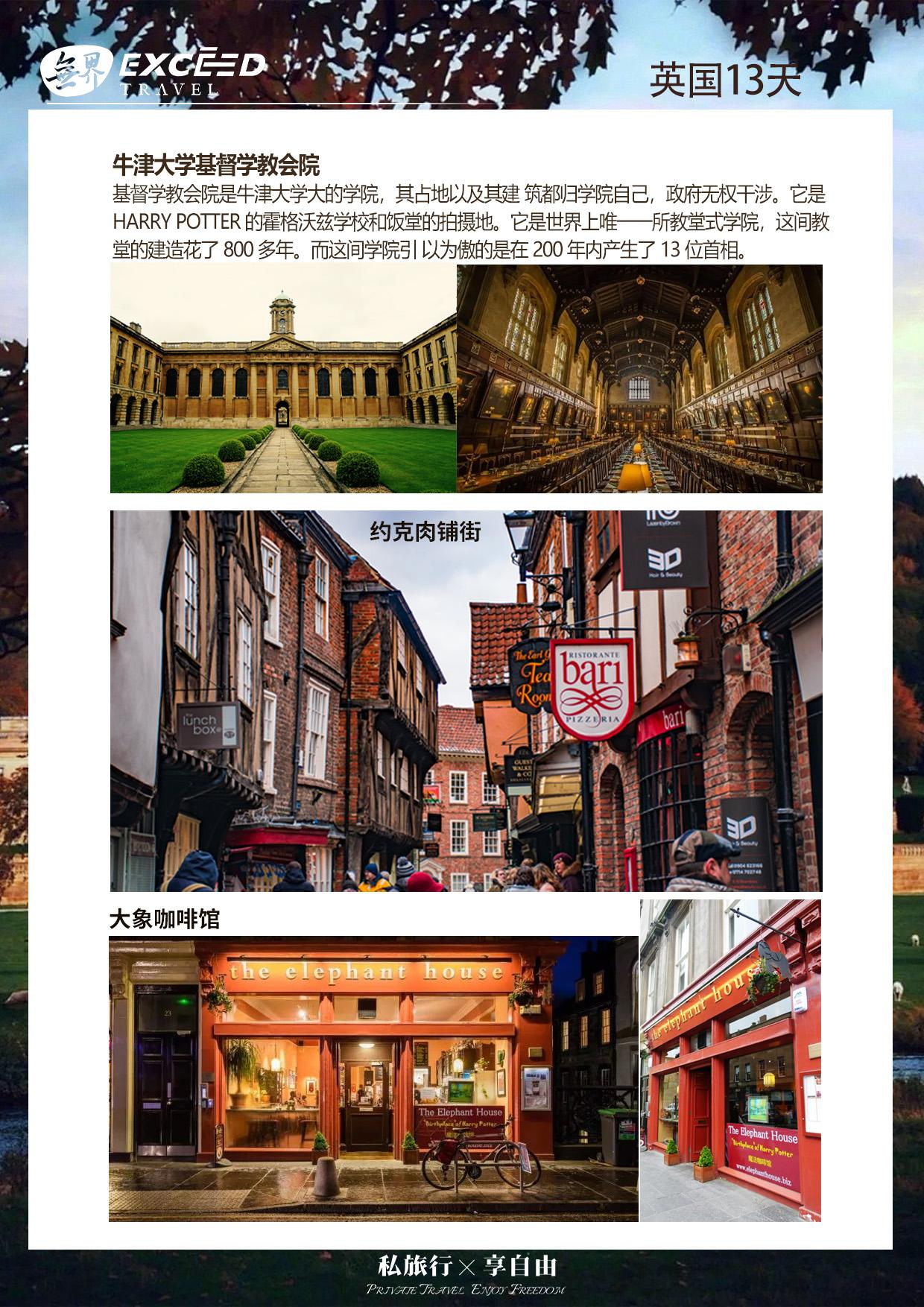 游览牛津大学城。这里曾是布莱尔、克林顿、撒切尔夫人等世界名人的母校。牛津大学城内的基督学教会院★(入内)是牛津大学大的学院,其占地以及其建 筑都归学院自己,政府无权干涉。它是 Harry Potter 的霍格沃兹学校和饭堂的拍摄地。它是世界上唯一一所教堂式学院,这间教堂的建造花了 800 多年。而这间学院引 以为傲的是在 200 年内产生了 13 位首相。同时也是《哈利波特》的拍摄地,霍格沃兹魔法学院中四大学院一同用餐的餐厅就是采用基督堂学院的餐厅 The Great Hall 所打造。