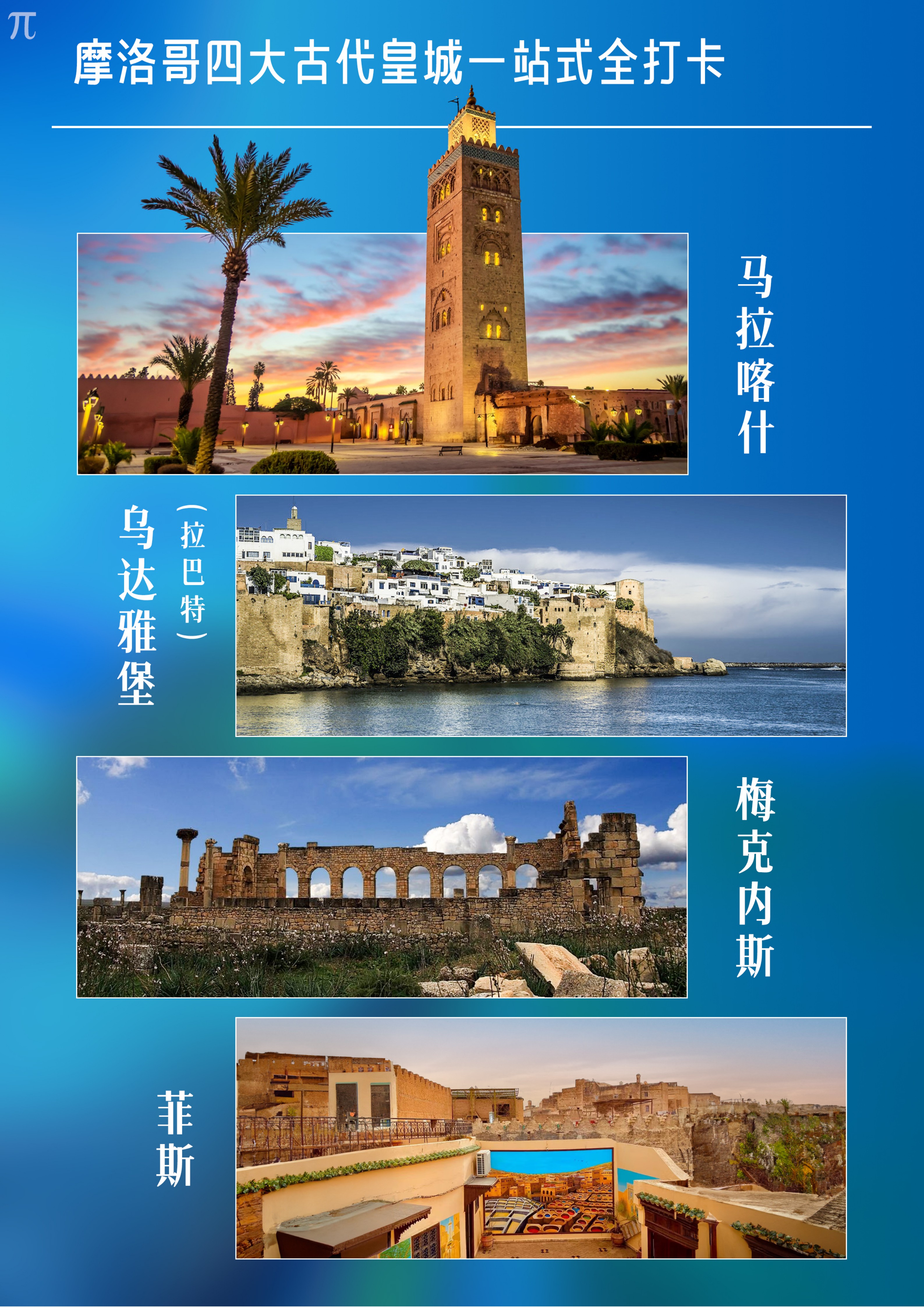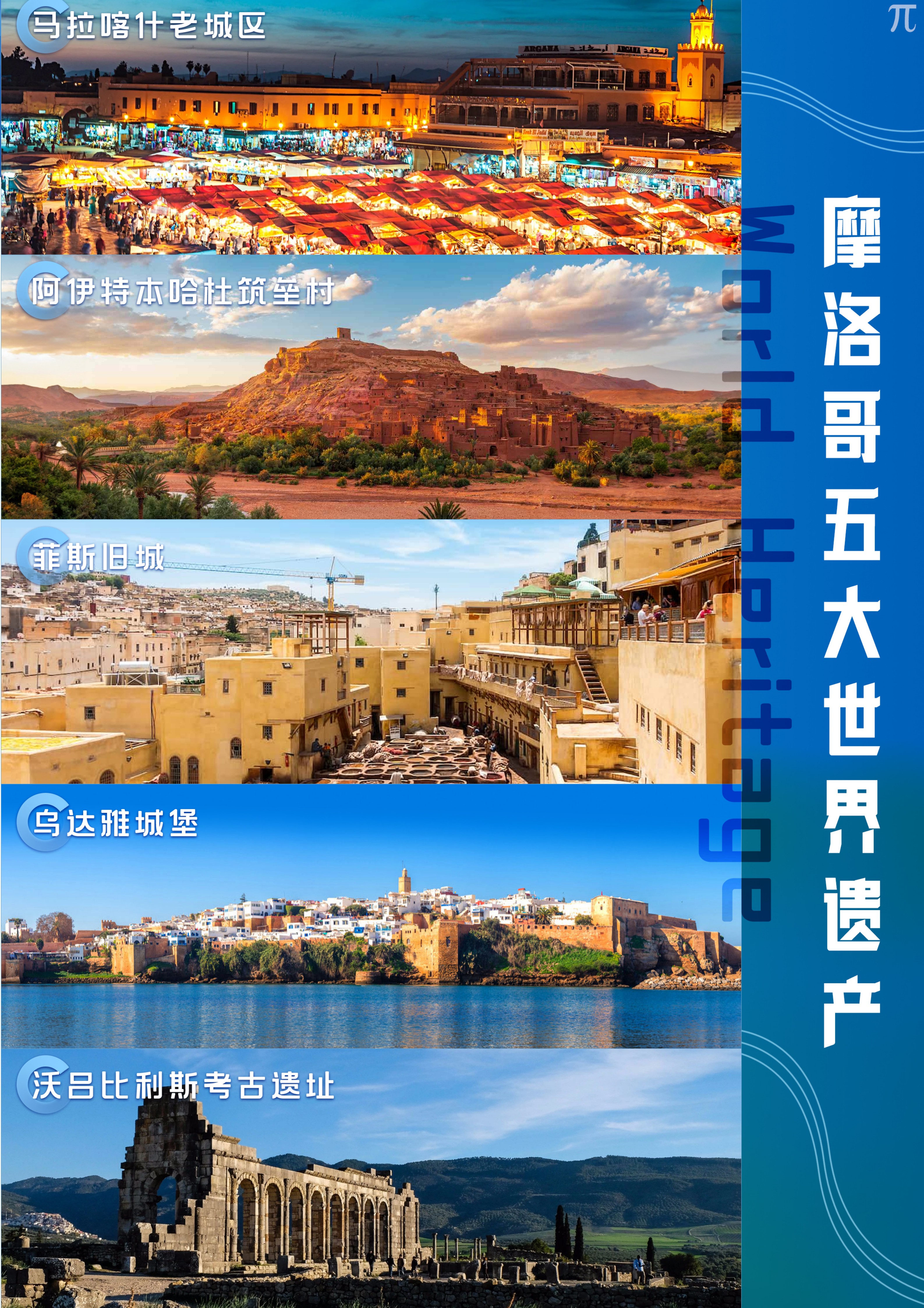游览世界第一所大学【卡鲁因大学/卡拉鲁因清真寺(外观)】,卡鲁因大学(University of Al-Karaouine)其历史比欧洲大学之母博洛尼亚大学还要早两百多年,堪称世界上最古老的大学。参观著名的【“大染坊”】,摩洛哥菲斯的染坊保留着传统搓揉及风干的古老方法,让天然植物的颜色在皮革上自然呈现,也正因为这些非常落后的染色手法,才使得菲斯的皮革比其它地方染出来的皮革质地更加柔软颜色更加持久,才使得菲斯的皮革制品蜚声世界,1981年菲斯被列为世界文化遗产,传统皮革染坊是它成为世界文化遗产的重要因素之一。(温馨提示:“大染坊”附近有很多当地的皮革商铺,此非购物点请知悉。)