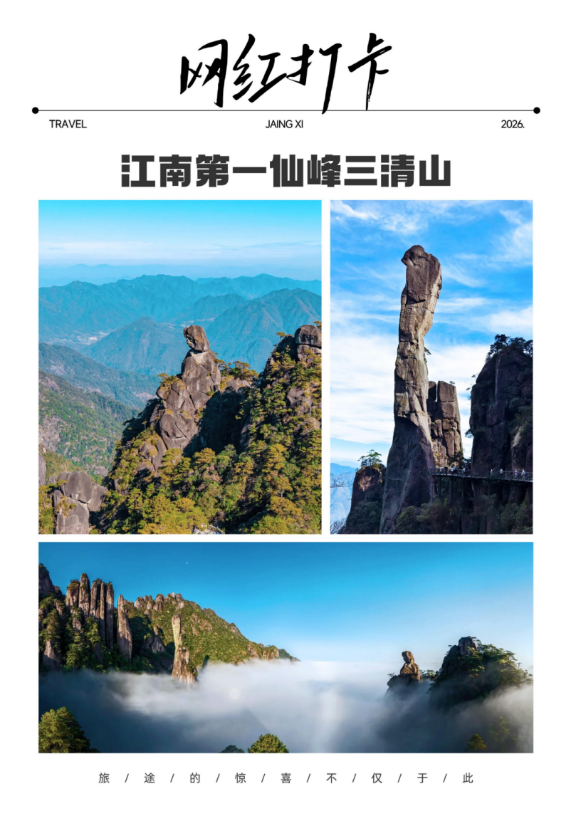 【三清山】国家AAAAA级景区,享有“江南第一仙峰”、“云雾的家乡”、“松石的画廊”美誉,是世界自然遗产地。景区以奇峰怪石著称,如南清园区域的司春女神、巨蟒出山、万笏朝天等景观,以及西海岸景区的负松思过、观音送子、玉女献花等象形石群。东海岸(阳光海岸)包含玉田石、乾坤台等景点,云雾缭绕中如入仙境。