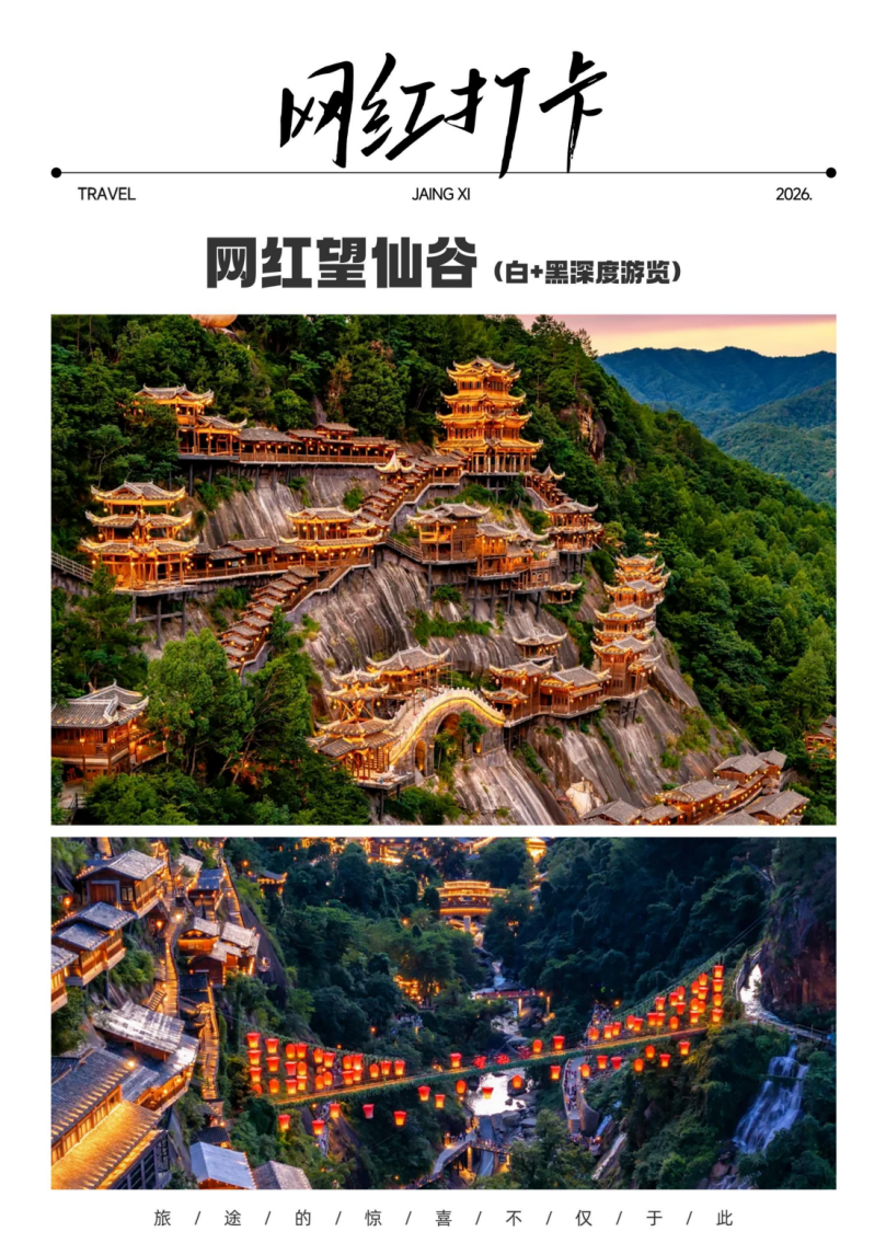 【望仙谷】新晋热门网红打卡地,斥资26亿打造的神仙浪漫小镇,以悬崖艺术、垂直挂壁、仙宿群等举国稀少的景观为特色,被誉为“山谷中的清明上河图”。景区内包含青云桥(寓意“平步青云”)、寻仙路峡谷栈道、廊桥(江西风雨廊桥形态)、三叠水叠瀑景观,以及九牛大峡谷、彩虹瀑、醉仙街、百舸桥等景点。
