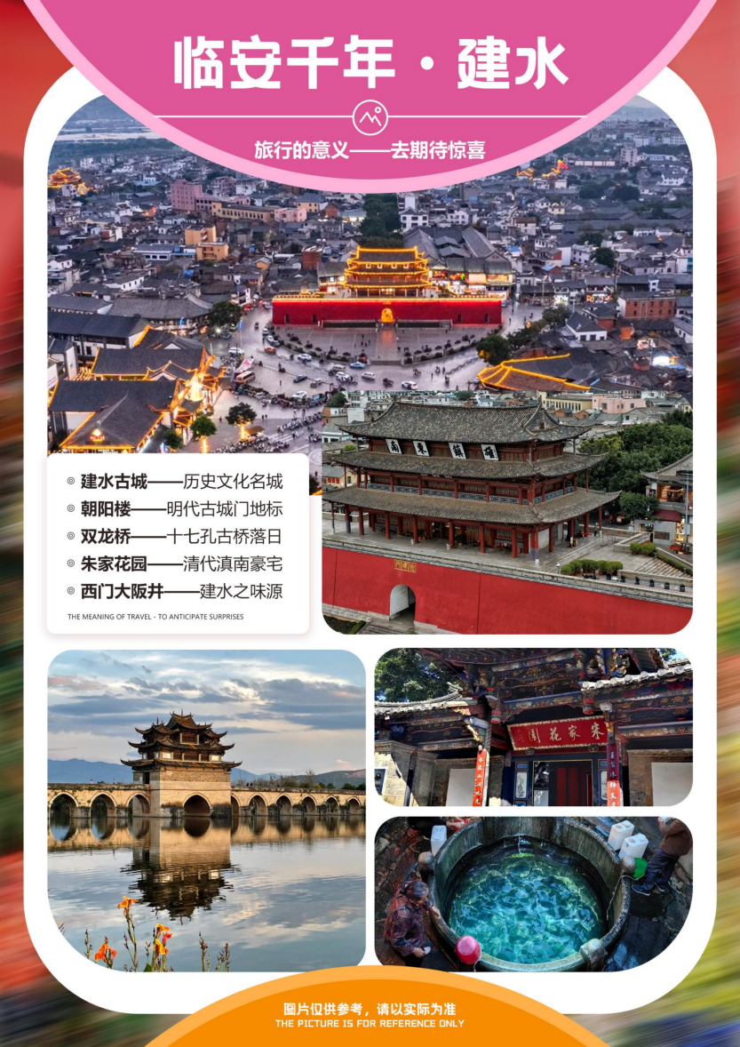 【建水古城】:古称临安,历史文化名城。特色玩法:漫步青石板街巷,感受汉儒文化与边地烟火交融,晚上可自行品尝建水烧烤,解锁舌尖非遗美味。