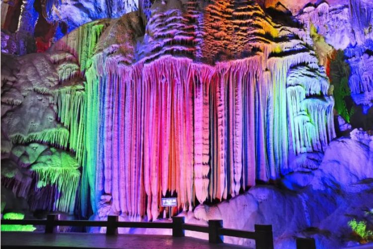 游览桂林喀斯特地貌溶洞奇观【银子岩】(游览时间约60分钟),银子岩溶洞是典型的喀斯特地貌,贯穿十二座山峰,属层楼式溶洞,洞内汇集了不同地质年代发育生长的钟乳石,有桂林最美岩洞之称。
